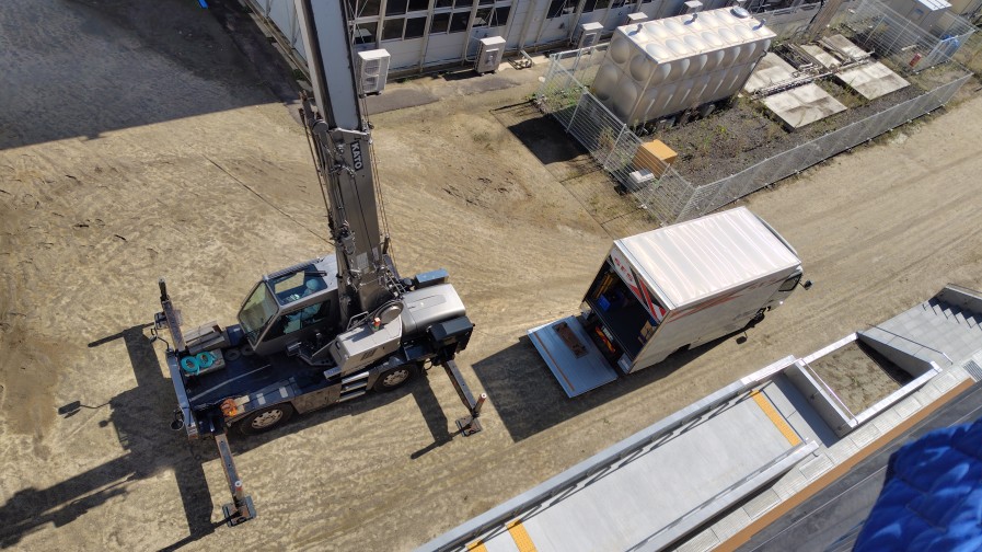2階から階段作業で降ろしラフターにて4階へ吊り上げ作業を無事に完了致しました。